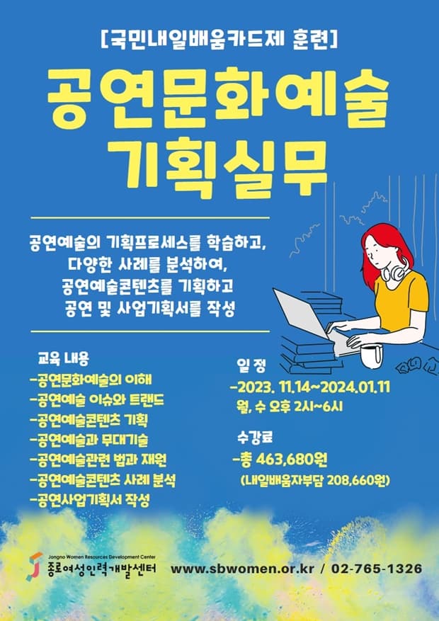 [내일배움] 공연문화예술 기획 실무 기간 : 2023-11-14 ~ 2024-01-11 장소 : 문의처 : 02-765-1326 요금 : 교육/체험 서울 예매하기