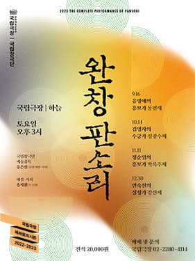 국립극장 <송년판소리> 기간 : 2023-12-30 ~ 2023-12-30 장소 : 국립극장 하늘극장 문의처 : 국립극장 02-2280-4114 요금 : 전석 30,000원 국악 서울 예매하기