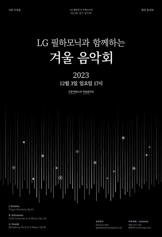 제12회 LG필하모닉 오케스트라 정기연주회 기간 : 2023-12-03 ~ 2023-12-03 장소 : 고양아람누리 아람음악당 문의처 : 010-9114-5697 요금 : 전석무료 음악/콘서트 경기 예매하기