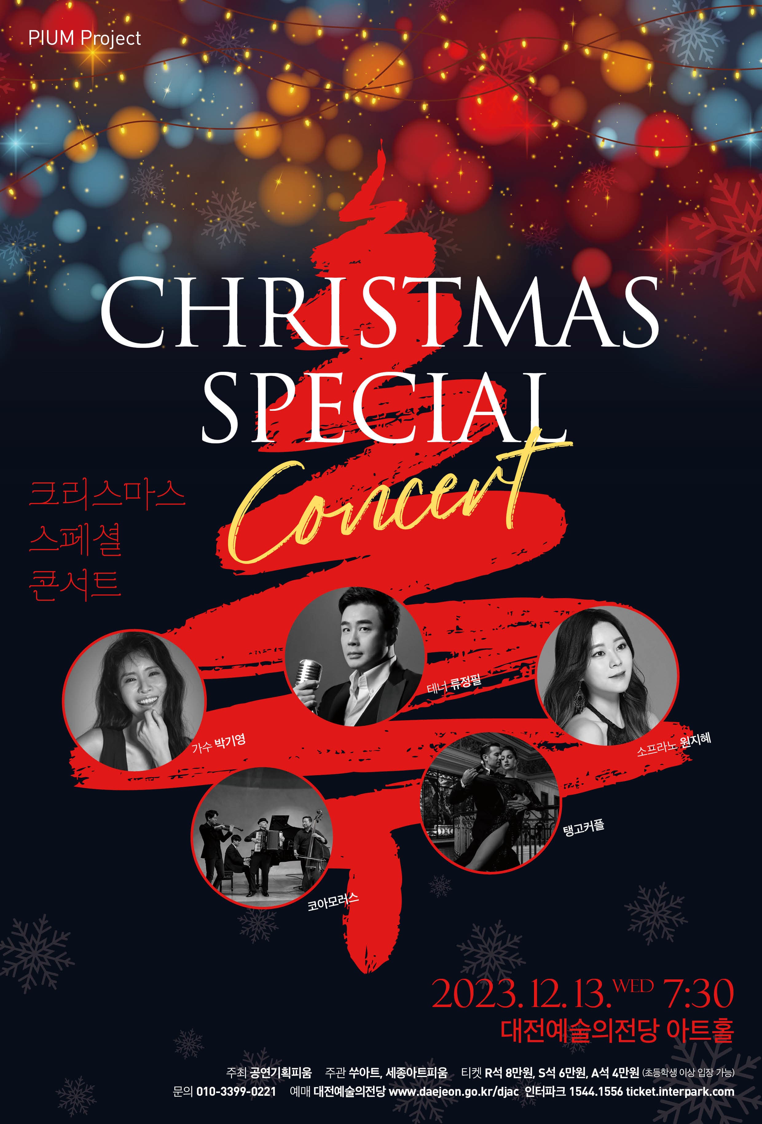 PIUM Project 크리스마스 스페셜 콘서트 기간 : 2023-12-13 ~ 2023-12-13 장소 : 대전예술의전당 문의처 : 공연기획피움 010-3399-0221 요금 : R석 8만원, S석 6만원, A석 4만원 음악/콘서트 대전 예매하기