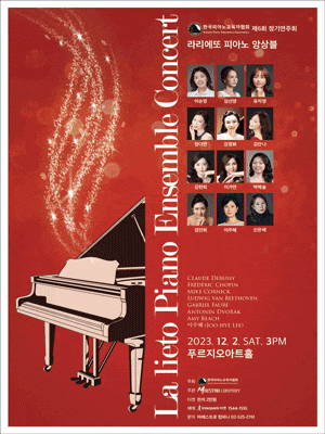 제6회 한국피아노교육자협회 정기연주회 기간 : 2023-12-02 ~ 2023-12-02 장소 : 푸르지오아트홀 문의처 : 마에스트로컴퍼니 02-525-2761 요금 : 전석 20,000원 음악/콘서트 서울 예매하기