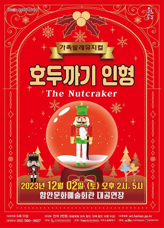 [함안] 호두까기 인형 기간 : 2023-12-02 ~ 2023-12-02 장소 : 함안문화예술회관 대공연장 문의처 : 함안문화예술회관 055-580-3627 요금 : R석 20,000원 무용/발레 경남 예매하기