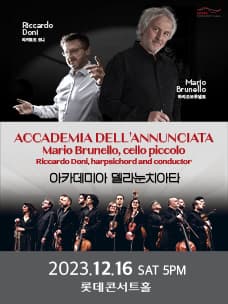 아카데미아 델라눈치아타 기간 : 2023-12-16 ~ 2023-12-16 장소 : 롯데콘서트홀 문의처 : 롯데문화재단 1544-7744 요금 : R석 160,000원, S석 120,000원, A석 90,000원, B석 50,000원 음악/콘서트 서울 예매하기