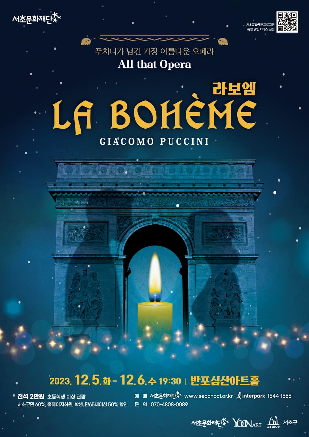 All that Opera <라보엠> 기간 : 2023-12-05 ~ 2023-12-06 장소 : 반포심산아트홀 문의처 : 02-3477-2805 요금 : 전석 2만원 (서초구민 60% / 서초문화재단 홈페이지 회원, 학생, 만65세이상 50%) 뮤지컬/오페라 서울 예매하기