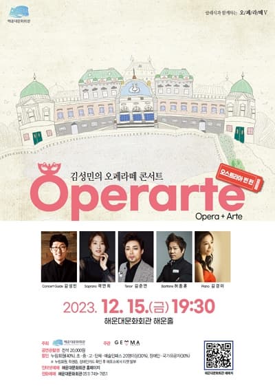 김성민의 오페라떼(Operarte) 콘서트, 오스트리아 빈편 기간 : 2023-12-15 ~ 2023-12-15 장소 : 해운대문화회관 해운홀 문의처 : 해운대문화회관 051-749-7651 요금 : 전석 20,000원 음악/콘서트 부산 예매하기