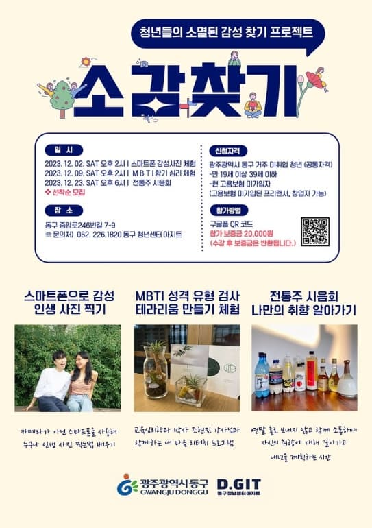 청년들의 소멸된 감성 찾기 프로젝트: 소감찾기 기간 : 2023-12-02 ~ 2023-12-23 장소 : 문의처 : 062-226-1820 요금 : 교육/체험 광주 예매하기