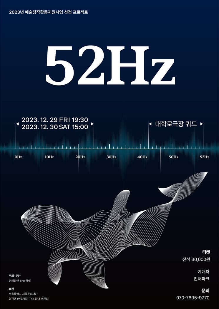 연희집단 The 광대 <52Hz> 기간 : 2023-12-29 ~ 2023-12-30 장소 : 서울문화재단 대학로극장 쿼드(예술청) 문의처 : 연희집단 The광대 070-7695-9770 요금 : 전석 30,000원 국악 서울 예매하기