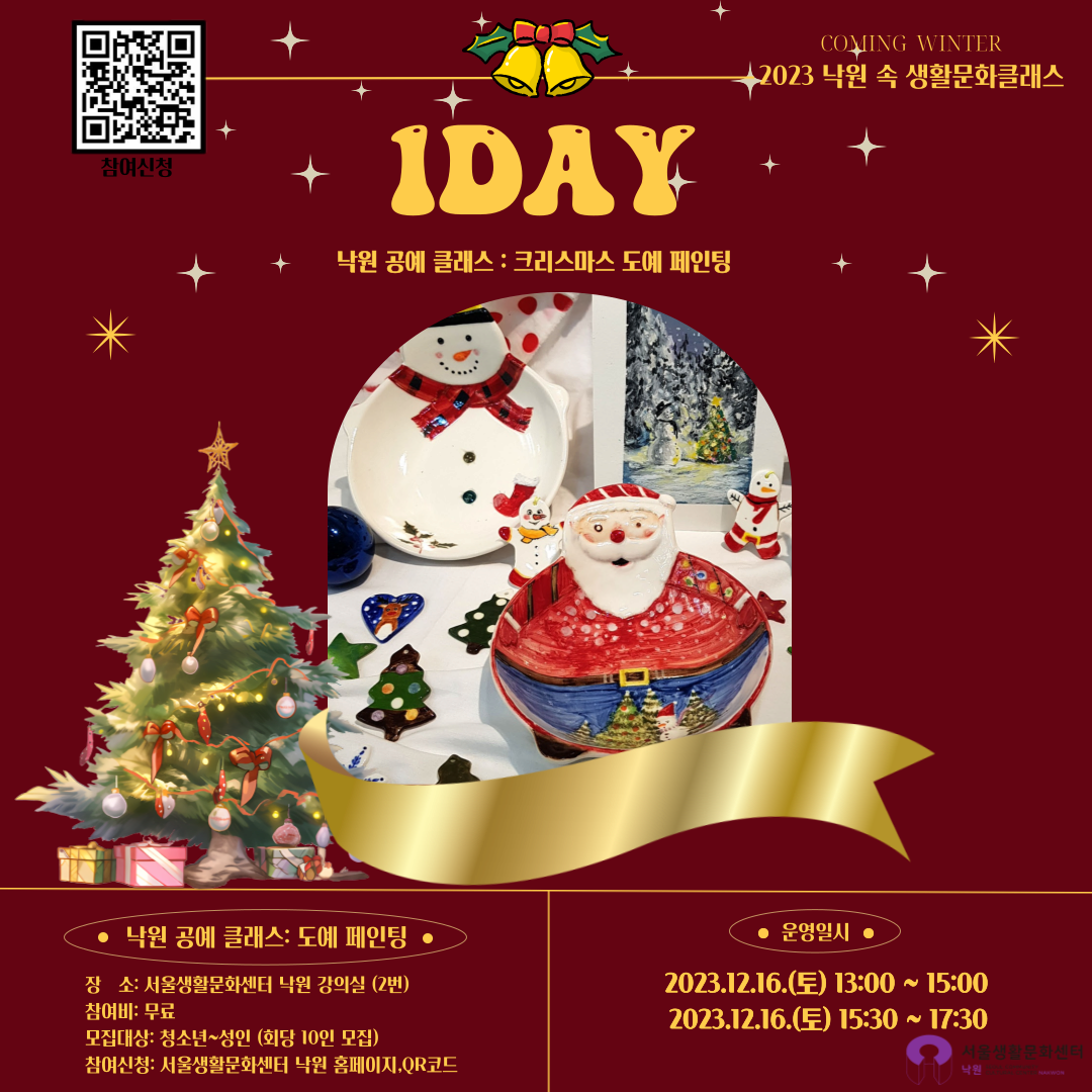 2023 낙원 공예 원데이 클래스 : 크리스마스 도예 페인팅 기간 : 2023-12-16 ~ 2023-12-16 장소 : 문의처 : 02-6959-8323 요금 : 교육/체험 서울 예매하기