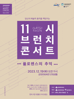 11시 브런치 콘서트, 플로렌스의 추억 기간 : 2023-12-19 ~ 2023-12-19 장소 : 금정문화회관 소공연장(은빛샘홀) 문의처 : 금정문화회관 051-519-5661~4 요금 : 전석 15,000원 음악/콘서트 부산 예매하기