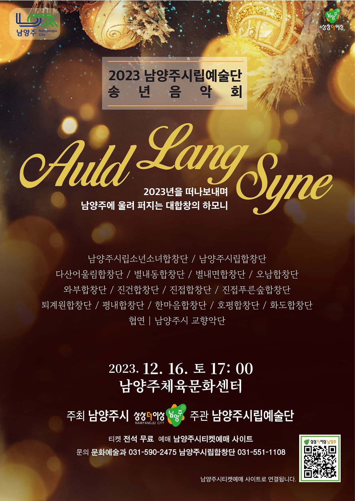 남양주시립예술단 송년음악회: Auld Lang Syne 기간 : 2023-12-16 ~ 2023-12-16 장소 : 남양주체육문화센터 문의처 : 남양주문화예술과 031-590-2475 요금 : 전석무료 음악/콘서트 경기