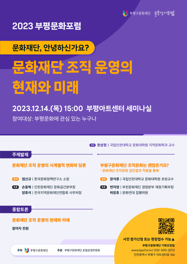 2023 부평문화포럼 <문화재단 조직 운영의 현재와 미래> 기간 : 2023-12-14 ~ 2023-12-14 장소 : 부평아트센터 세미나실 문의처 : 기획조정팀 032-500-2013 요금 : 행사/축제 인천 예매하기