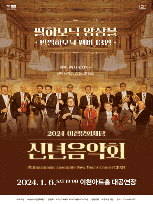 [이천] 이천문화재단 신년음악회, 빈필하모닉 앙상블 기간 : 2024-01-06 ~ 2024-01-06 장소 : 이천아트홀 대공연장 문의처 : 031-636-2202 요금 : R석 50,000원, S석 30,000원, A석 10,000원 음악/콘서트 경기 예매하기