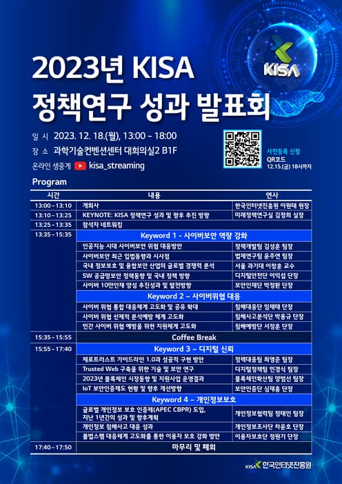 2023 KISA 정책연구 성과 발표회 기간 : 2023-12-18 ~ 2023-12-18 장소 : 과학기술컨벤션센터 대회의실 2 문의처 : 061-820-1165 요금 : 행사/축제 서울 예매하기
