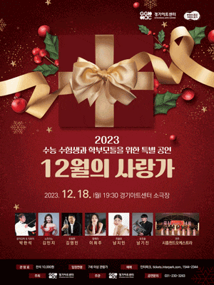 [수원] 12월의 사랑가 기간 : 2023-12-18 ~ 2023-12-18 장소 : 경기아트센터(구. 경기도문화의전당) 소극장 문의처 : 031-230-3200 요금 : 전석 10,000원 기타 경기 예매하기