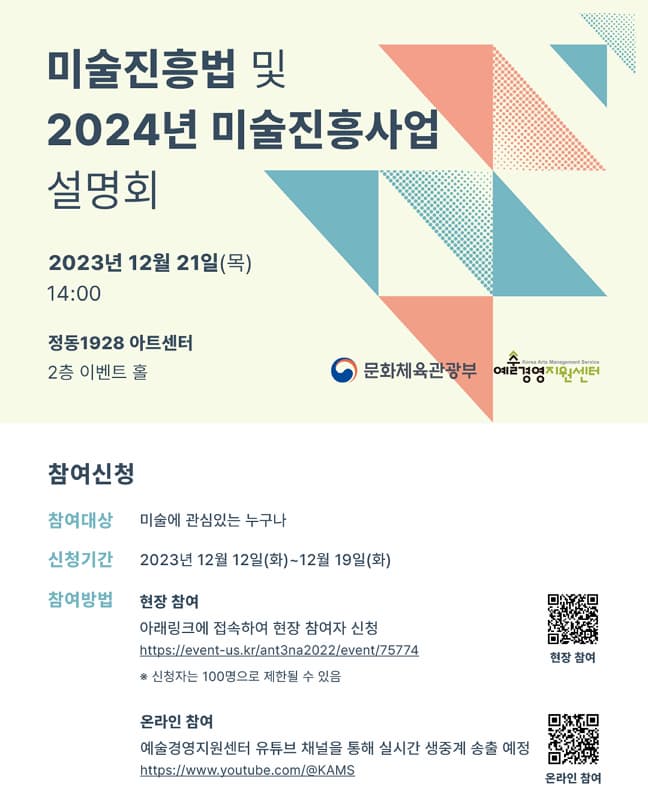 미술진흥법 및 2024년 미술진흥사업 설명회 기간 : 2023-12-21 ~ 2023-12-21 장소 : 정동1928 아트센터 2층 이벤트홀 문의처 : 시각정보팀 02-708-2219 요금 : 행사/축제 서울 예매하기