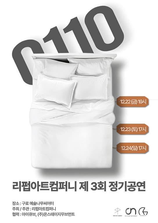 제3회 리펍아트컴퍼니 정기공연: 0110 기간 : 2023-12-22 ~ 2023-12-24 장소 : 예술나무씨어터(구. 상상나눔씨어터) 문의처 : 010-6232-1158 요금 : 전석 20,000원 무용/발레 서울 예매하기