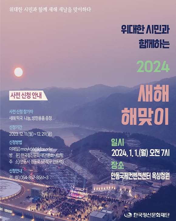 위대한 시민과 함께하는 2024 새해 해맞이 기간 : 2024-01-01 ~ 2024-01-01 장소 : 안동국제컨벤션센터 옥상정원 문의처 : 054-857-8561~3 요금 : 행사/축제 경북 예매하기