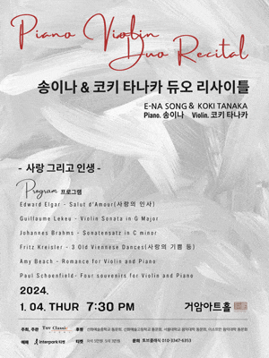 송이나 & 코키 타나카 듀오 리사이틀 기간 : 2024-01-04 ~ 2024-01-04 장소 : 거암아트홀 문의처 : 토브클래식 010-3347-6353 요금 : R석 50,000원, S석 30,000원 음악/콘서트 서울 예매하기