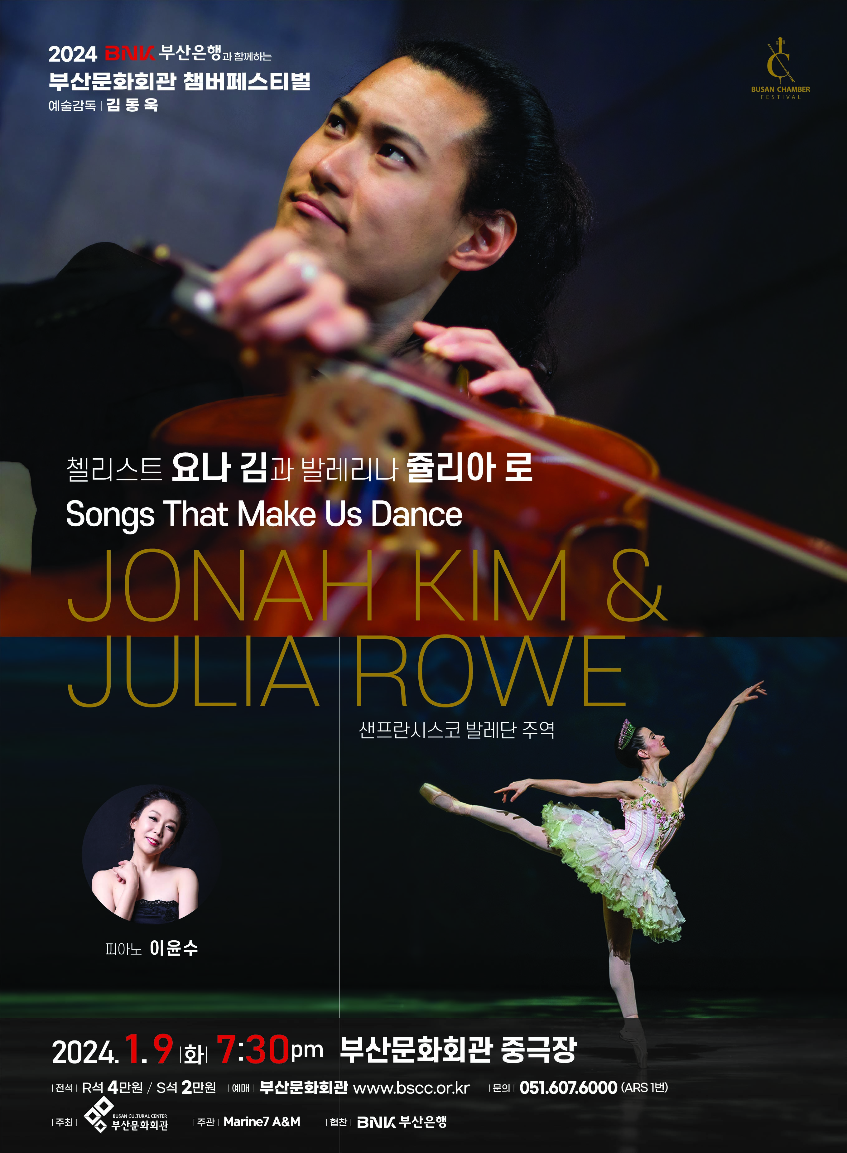 부산문화회관 챔버페스티벌, 챌리스트 요나 김과 쥴리아 로 기간 : 2024-01-09 ~ 2024-01-09 장소 : 부산문화회관 중극장 문의처 : 부산문화회관 051-607-6000(ARS 1번) 요금 : R석 40,000원, S석 20,000원 음악/콘서트 부산 예매하기
