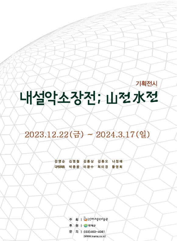 기획전시 「내설악소장전; 山전水전」 기간 : 2023-12-22 ~ 2024-03-17 장소 : 공립 인제내설악미술관 문의처 : 공립인제내설악미술관 033-463-4081 요금 : 무료 전시 강원 예매하기