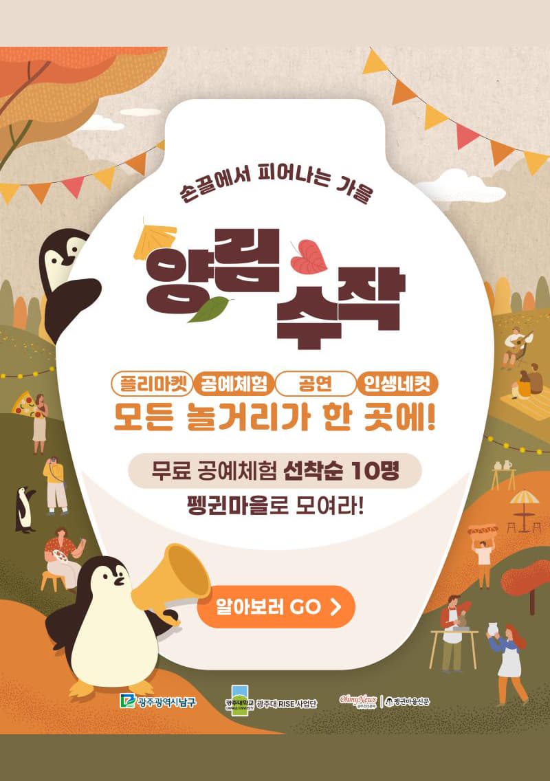 손끝에서 피어나는 가을 기간 : 2025-09-13 ~ 2025-10-25 장소 : 양림동펭귄마을공예거리 문의처 : 062-674-5708 요금 : 무료 행사/축제 광주 예매하기