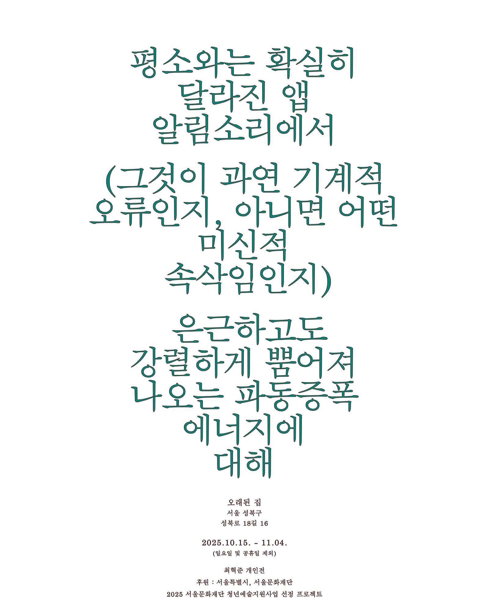 최혁준 개인전 《평소와는 확실히 달라진 앱 알림소리에서 … 나오는 파동증폭 에너지에 대해》