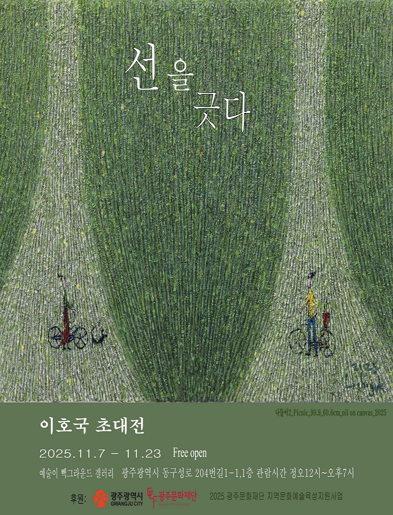 선을 긋다 기간 : 2025-11-07 ~ 2025-11-23 장소 : 예술이빽그라운드 문의처 : 예술이 빽그라운드 갤러리 0507-1422-0539 요금 : 무료 전시 광주 예매하기