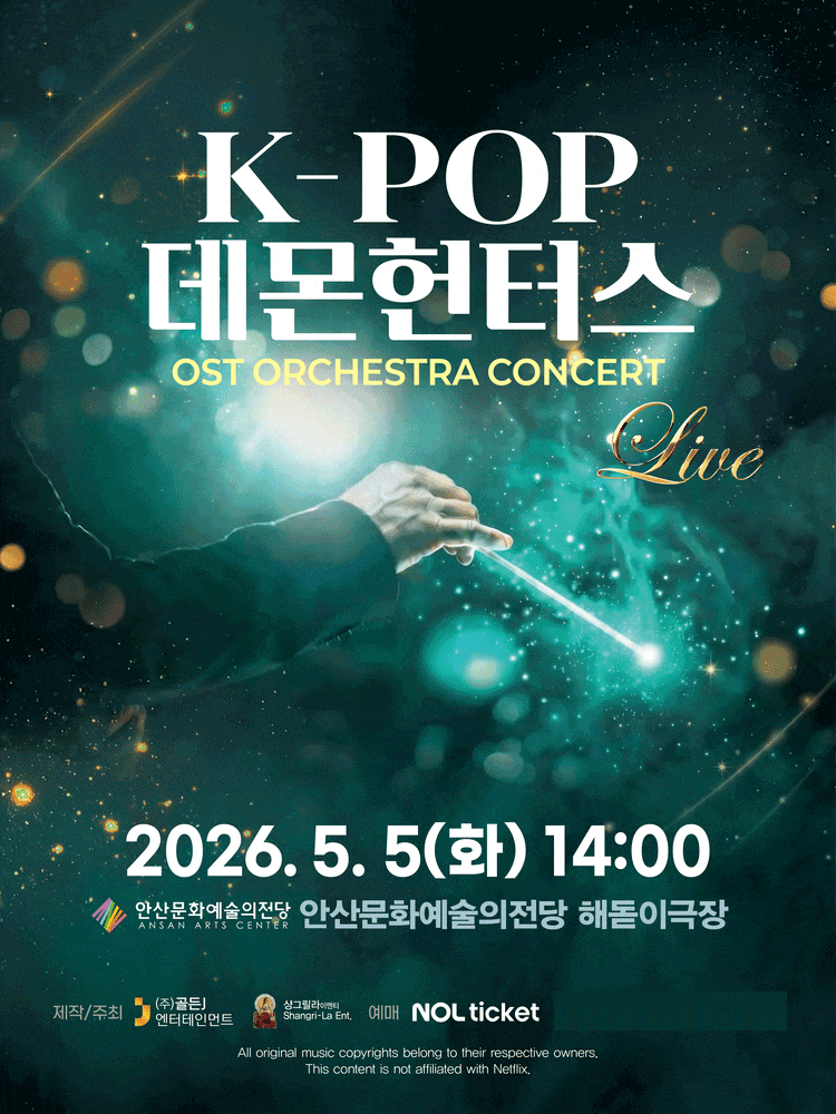 [안산] 케이팝 데몬 헌터스 OST 오케스트라 콘서트 기간 : 2026-05-05 ~ 2026-05-05 장소 : 안산문화예술의전당 해돋이극장 문의처 : 02-318-3005 요금 : R석 130,000원, S석 110,000원, A석 90,000원, B석 60,000원 음악/콘서트 경기 예매하기